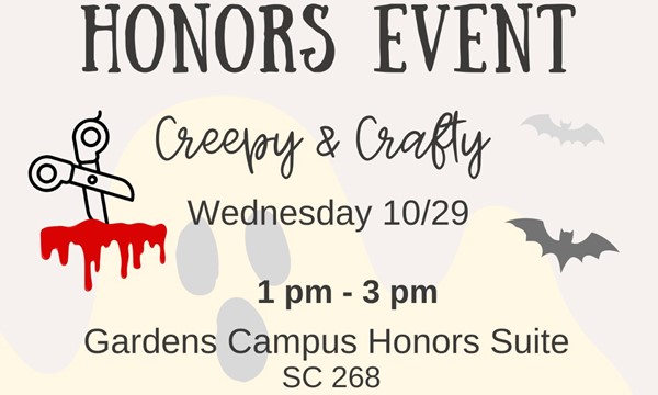 Creepy & Crafty - Honors College Event We will create some spooky-inspired props for our haunted table event the following day. Join us for a spirited craft session. Help create table decor, signage and slime. Date: Wednesday, October 29th Location: Honors Suite, SC 268, at the Gardens Campus Time: 1:00 pm to 3:00 pm RSVP to Professor Darling at ramoss@pbs.cedu by Monday , October 27th. *Earn 1 Honors Activity Point From
