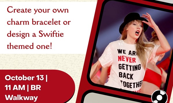 - Taylor Swift Charm Bracelet Making (Cancelled)Taylor Swift Charm Bracelet Making Create your own "Swifties" theme charm bracelet! Time: 11AM-2PM Date: October 13, 2025 Location: Pavilion From to at Pavilion.