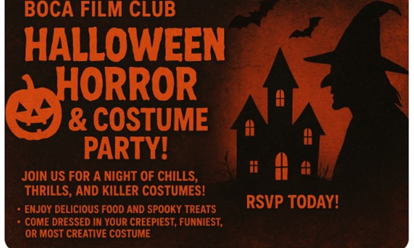 Boca Film Club Halloween Horror Film & Costume Party Get ready for a frightfully fun time at the Boca Film Club Halloween Horror & Costume Party!Join us for chills, thrills, and creative costumes as we screen a classic scary movie that’s sure to make you jump. Come for the food, stay for the scares… if you dare! From