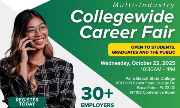 - Fall 2025 Collegewide Career FairFall 2025 Collegewide Career Fair Students and graduates will have the chance to meet with Recruiters and Managers from over 30 leading organizations recruiting for part-time, full-time, internship, and volunteer positions. This is a multi-industry career fair with employers representing a diverse range of industries and occupations. Dress professionally and bring copies of your resume! Early access for PBSC students, graduates, and military veterans from 10 a.m. to 10:30 am. Please register to let us know you're attending: https://www.careersourcepbc.net/registration From to at Boca Raton Campus - HT103 (Conference Room).