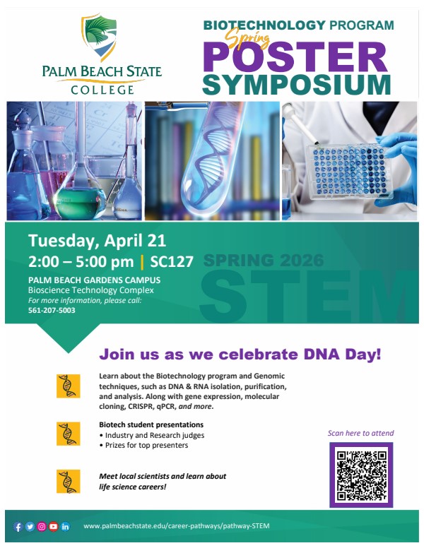 - Biotechnology Fall Poster SymposiumBiotechnology Fall Poster Symposium Join us at the Proteomics Poster Symposium -- Meet local scientists & discover exciting life science careers! Learn about PBSC's Biotechnology program and the field of proteomics. Explore methods such as chromatography, protein quantification, polyacrylamide gel electrophoresis, Western Blot, ELISA, enzyme kinetics, and more. See our Biotech student presentations with prizes for the top presenters, judged by industry and research professionals. Don't miss it! From to at Palm Beach Gardens campus - SC217 (Bioscience Complex).