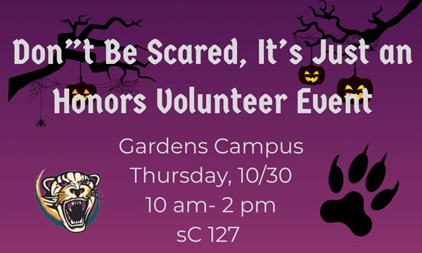 - Honors College: Volunteer Opportunity at the Gardens CampusHonors College: Volunteer Opportunity at the Gardens Campus Join us for a spooktacular tabling event. In partnership with the student activities' haunted house, Honors will assist with student check-in and prove that Honors isn't so scary! Date: Thursday, October 30th Time: 10:00 am to 2:00 pm Location: SC 127 at the Gardens Campus RSVP to Professor Darling at ramoss@pbsc.edu *Earn Service Points From to at SC 127 at the Gardens Campus.